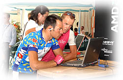 Zabel consulte l'internet. A ses côtés Cadel Evans. Nul doute