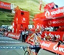 Rasmussen échappé avec aitor Osa depuis la vallée de Argeles Gazost, en solo dans les premiers reliefs à 4% de la montée de Cauterets.