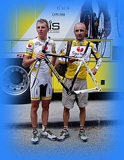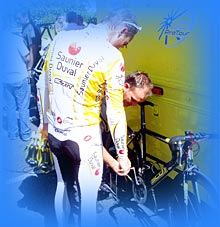 autant par les Saunier Duval que par ceux d'autres équipes. En haut à gauche: Bertogliati - en bas Ochoa, ancien vainqueur de Hautacam dont le frère avait été fauché par une voiture à l'entrainement. Les coureurs et mécanos sont éberlués par les 60 tours du pédalier débarassé de sa chaine, |