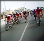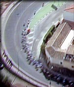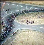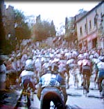 Le peloton qui aborde les pentes menant à la cité