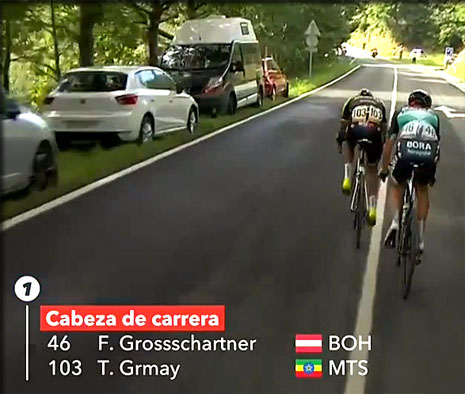 Grmay rejoint Grosschartner à l'avant, ils sont dans la descente menant au dernier alto