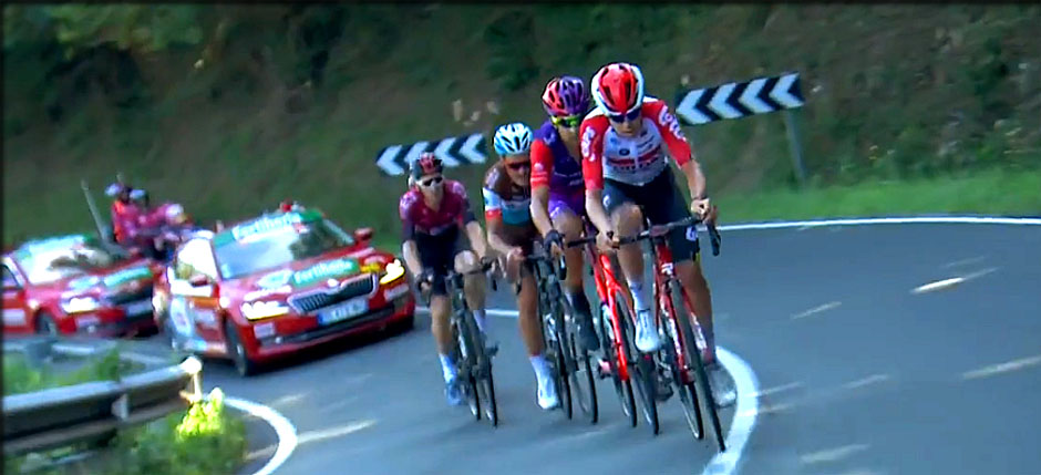 Ecart entre les 6 et le peloton: 2' 08" - on est de plus en plus convaincu que ce sera une arrivée au sprint cet après midi à Oviedo . Le sommet de la bosse pas tres difficile est situé à 23 km de l'arrivée, c'est assez pour que les équipes se réorganisent pour un sprint massif à l'arrivée. Est-ce que des sprinters comme ARNDT, ARUNBURU, MEZDEC, RICHEZE, ( si Jakobsen n'est pas au top) pourraient filer dans l'alto de la Madera , car on sait qu'il les passent mieux que BENNETT et surtout mieux que JAKOBSEN ? on verra bien ...