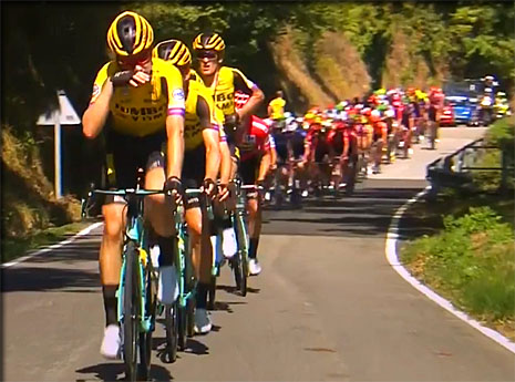 ROGLIC vient de se ravitailler > glou glou . Toujours TONY MARTIN en tête des JUMBO VISMA qui emmènent le peloton.