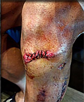A qui est ce genou ? à Will SMIITT , et il n'a pas abandonné, il est bel et bien en course et pédale avec ça !