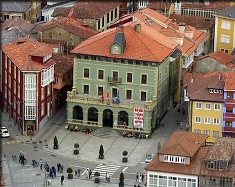 TINEO place hotel de ville et façades à fenêtres balconnées typiques en Asturies