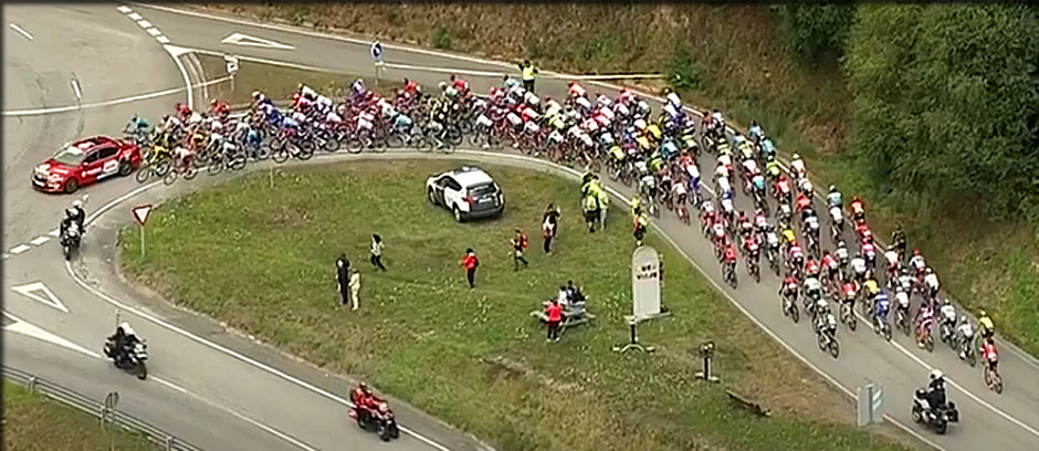 Ecart 3' 49" - On voit bien que le peloton ne laisse pas trop de champ aux 17 échappés, mais eux aussi ne roulent pas à fond ! Tout le monde s'économise, la fatigue des jours précédents se fait senti