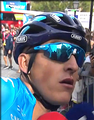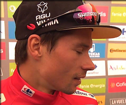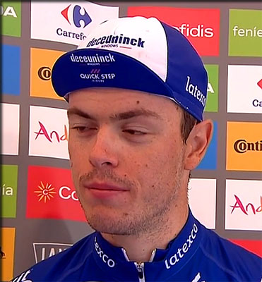 , tranquille, se borne à dire qu'il va visionner les images sur EUROSPORT ce soir, car il n'a pas vu ce qui s'est passé devant après la chute ( pourtant il le sait très bien ...les oreillettes ça sert à quoi ?) , prudence oblige !