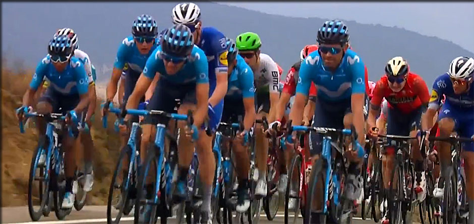 les Movistar roulent à l'avant ... Vraiment pas réglo ! les gars . Philippe Gilbert tente de raisonner les Movistar qui font semblant de rien et continuent de rouler sans trop oser quand même de crainte de se faire allumer sérieusement par le peloton et les observateurs.