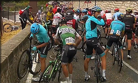 TONY MARTIN doit abandonner - La chute est intervenu dans un virage de village à cause de la route glissante ... on l'avait dit : take care ! et pourtant patatrac !