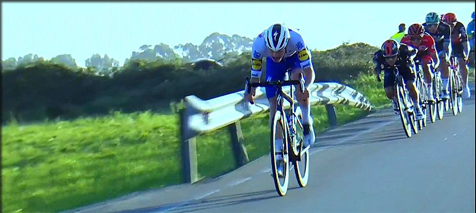 ne pourrait pas jouer les premiers rôles en le voyant distancé dans les 3 bosses précédent l'arrivée, on s'est pris à penser que les leaders les plus punchers pouvaient prendre la direction des opérations puisque les 4 échappés étaient rejoints.