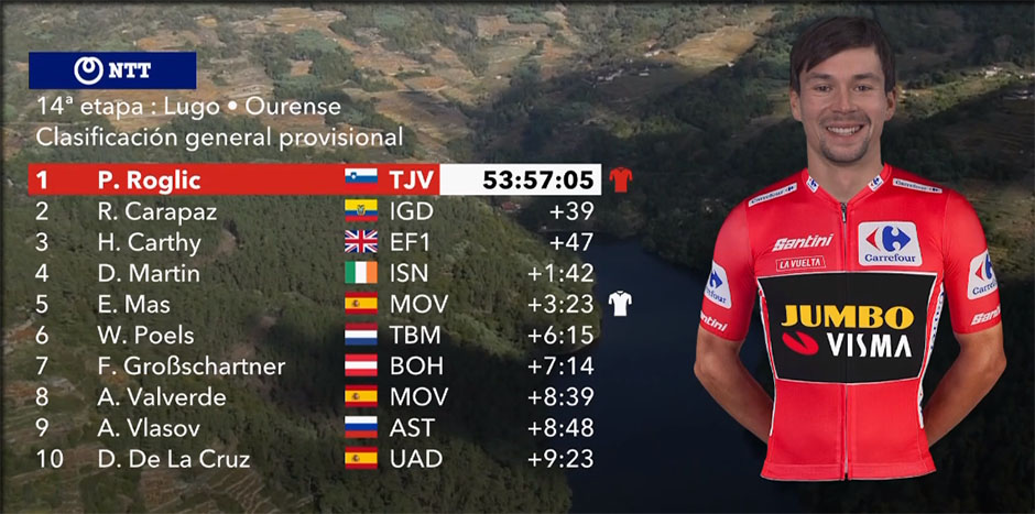 ROGLIC est en rouge, mais il est aussi détenteur du maillot vert, qu'il va certainement ramner à Madrid. pour le rouge, ça reste à voir !