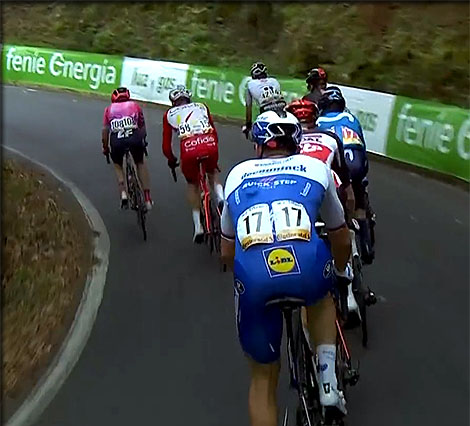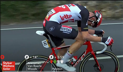 Regroupement et attaque de la bosse à 1,8km de l'arrivée - M. WOODS tente de controler les attaques, d'abord de SOLER, mais WELLENS va déboucher de façon décisive et Woods ne parvient pas à le remonter