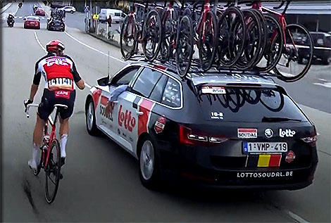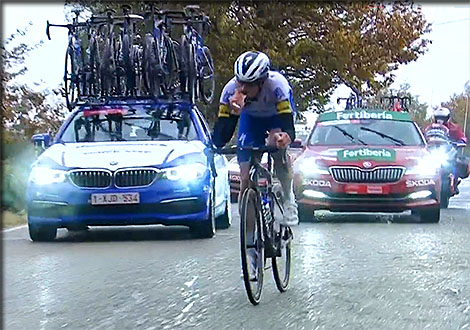 Les coureurs de tête ne sont plus que 12 - TIM WELLENS est victime d'un coup de fringale ou d'un excès de fatigue accumulée ces derniers jours , il capitule et se laisse distancer, il va être avalé par le peloton