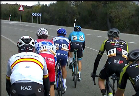 Pas de chance pour Guillaume Martin qui a raté l'échappée et doit chasser derrière un groupe costaud qui s'entend bien et ne l'attend pas - Avec Simon et martinez il a un retard de 1'18'' au pied de la montée de l'Alto de Carcedo : 6,5km, 3,6%.