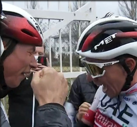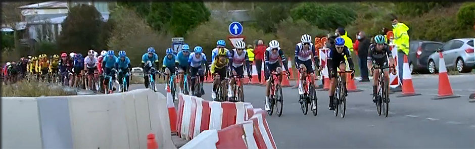 56" d'avance encore pour Cattaneo qui va avoir du mal à rallier la ligne en vainqueur malgré son exploit - il perd du temps régulièrement sur le peloton lancé à vive allure de nouveau emmené par les Bora, mais pour qui ?