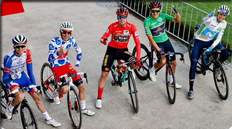 La pause au départ depuis l'hippodrome de la Zarzuela pour les 5 coureurs ttrès remarqués de cette Vuelta: GAUDU - MARTIN - ROGLIC - CARAPAZ - MAS