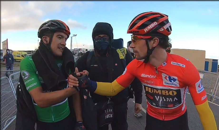 A l'arrivée à la Covatilla hier, la belle poignée de main entre CARAPAZ et ROGLIC les deux coureurs probablement les meilleurs actuellement sur les grands tours sans oublier le jeune vainqueur du tour de France 2020 Tadej POGACAR