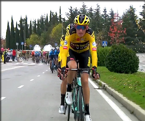 Le valeureux vétéran de l'équipe JUMBO VISMA Robert GESINK est en tête dans les faubourgs de Madrid avant l'entrée dans la ville elle même