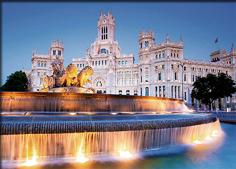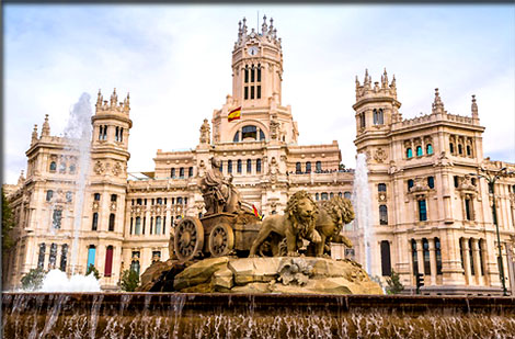 Fontaine de Cibeles et le Palacio de Cibeles en arrière plan devant lequel sera installé ce soir le podium final de la Vuelta 2020
