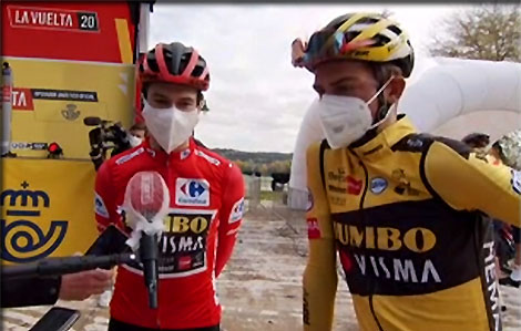 Roglic ici interviewé au départ avec son fidèle lieutenat Sepp Kuss , très heureux tous deux du comportement parfait de l'équipe