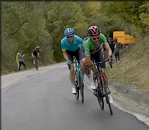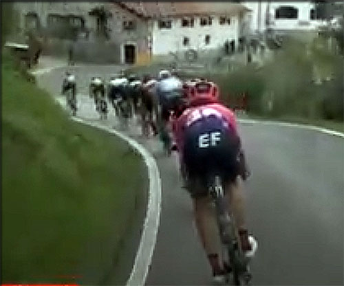 Soler échappé du groupe de tête à 10km de l'arrivée sur une route a chaussée en très bon état en fort faux plat descendant.