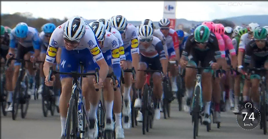 Cavagna pour la Quickstep qui embraye à plus de 65 kmh après s'être économisé avant le deuxième km