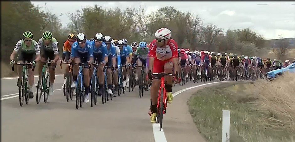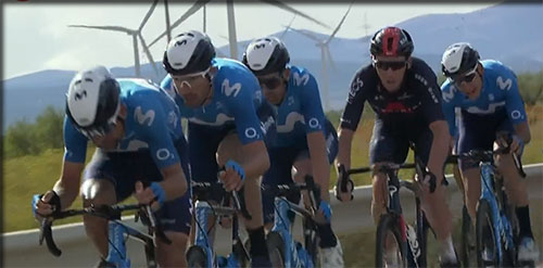 Les Movistar sur les routes d'Aragon tentent de lancer des bordures à des vitesses verigineuses: jusqu'à 68km/h, mais la vent n'est pas assez fort pour y parvenir et ça se relève un peu, du coup les 4 de tête insistent alors que leur avance s'était réduite à moins d'une minute.