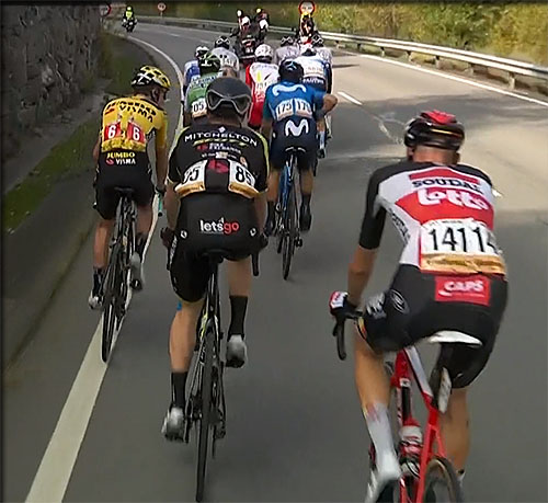A noter la nette supériorité numérique de la Sunweb avec 3 coureurs et de la Cofidis avec 2 coureurs dans l'échappée qui n'a toujours pas pris une avance suffisante pour que le peloton les laisse filer, Bora Hansgrohe et Trek Segafredo en tête, qui n'ont pas de représentant à l'avant