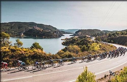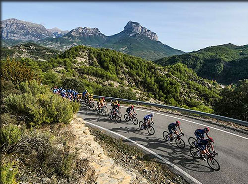 Le peloton des coureurs roulent dans les magnifiques paysages de la province de Huesca en Aragon