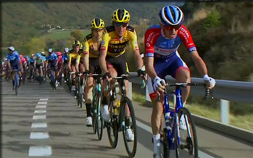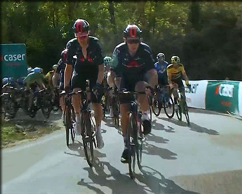 Ils restent sous la pression des 2 équipes espagnoles Caja Rural et Burgos qui abattent un gros boulot à l'avant du peloton