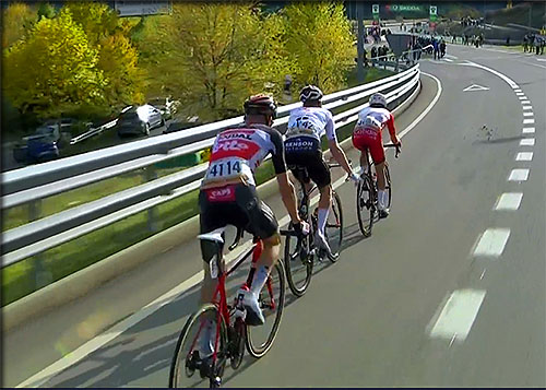 Les Ineos lèvent le pied, et du coup l'écart augmente de suite de 20" et s'établit à 4minutes, ce qui donne de grandes chances au trio de se disputer la victoire à l'arrivée