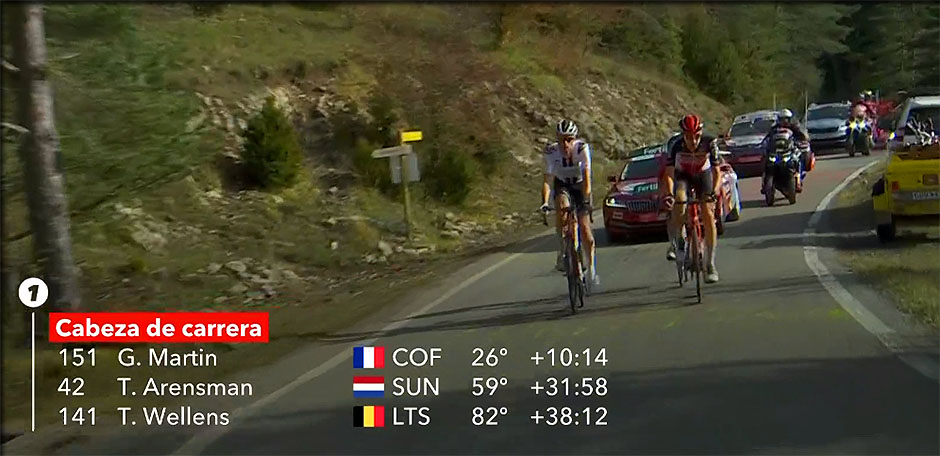 Le trio de tête est dans la descente de l'Alto de Fanlo passé en tête par Wellens qui est désormais à égalité de points avec Sepp Kuss