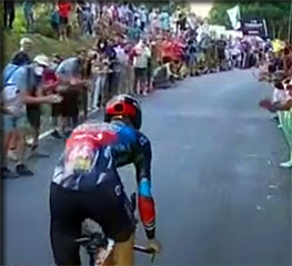 16h 50 - étape époustouflante - le groupe Roglic revient sur le groupe Bardet > 1mn d'écart - Gibbons afait un vrai numéro mais il semble faiblir à 2 km du sommet dans cet alto aux pentes très irrégulières.