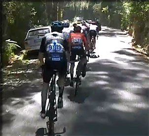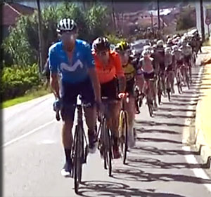 15h 15 - à l'avant du peloton on se décide à rouler pour revenir - écart 9,21" - il reste 86km - 3 coureurs de tête sont dans la descente: Champoussin, Dewulf et Calmejane - ils arrivent en bas et vont attaquer l'Alto de Mabia > 6,1km, 5,6%