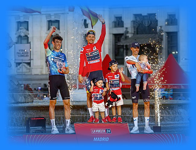 1er ROGLIC Vainqueur de la VUELTA 2024 à MADRID 2ème O' CONNOR à 2' 36" 3ème MAS à 3' 13" 4ème CARAPAZ à 4' 02'' 5ème SKEJLMOSE à 5' 49" 6ème Gaudu à 6' 32" 7ème Lipowitz à 7' 05" 8ème Landa à 8' 48" 9ème Sivakov à 10' 04" 10ème C. Rodriguez à 11' 19" |