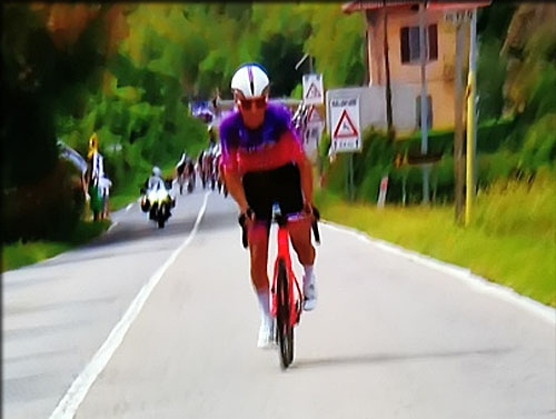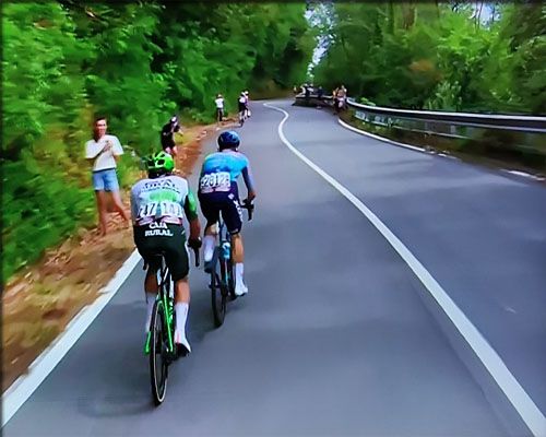 Alessandro Verre revenu comme une fleche sur Vinokourov et Reinderink qui avaient pris le large à 1,5km du sommet, franchit la ligne au sommet avec le Caja rural . Qui a passé la ligne en tête ? la moto n'a pas voir à cause de la courbure de la route au sommet.