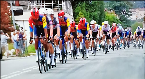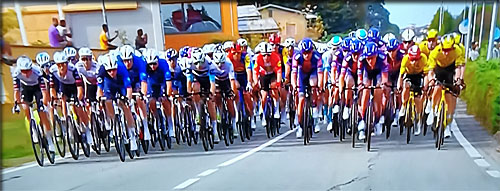 Le peloton et ses trains. Les Visma bien à gauche pour mieux prévenir une éventuelle chute grave au centre de la route