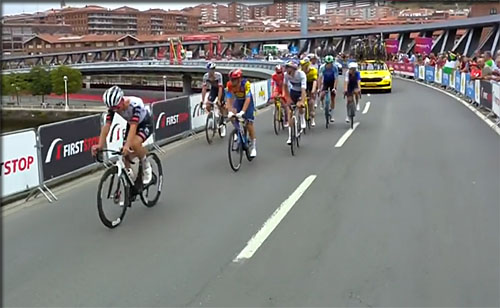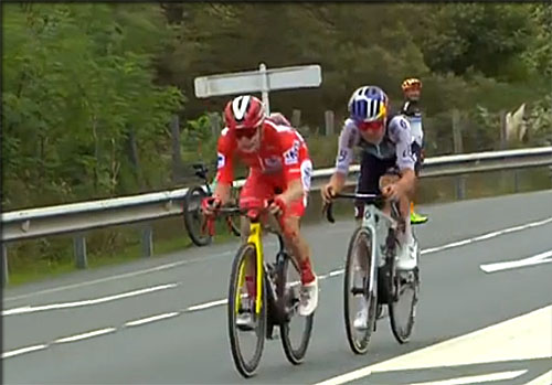 C'est Vingegaard qui est passé en tête devant Pidcock sur cette nouvelle ligne située en descente sur un point de controle des temps situé à 3 km de l'arrivée au couer de Bilbao