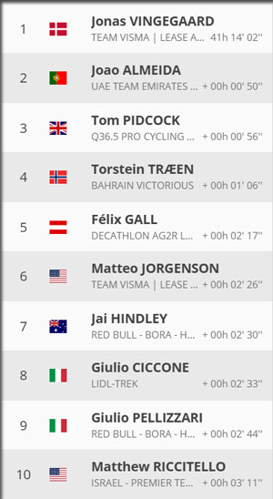 Fisher Black, Jay Hinley, Pellizzari se postent dans les premières positions ou revient Bernal. les UAE et Vingegaard coôte à côte