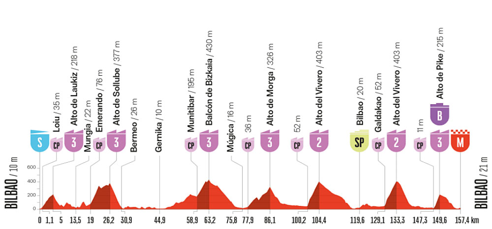 La partie finale de l'étape, plus dure sera décisive avec: le Balcón de Bizkaia, les 2 ascensions du Vivero et le Pike Bidea, butte courte 2,2km mais raide et dont le sommet est situé à 7,5 km de l'arrivée à Bilbao. Ce sera trop dur pour les sprinters, y compris sans doute pour ceux qui passent les bosses