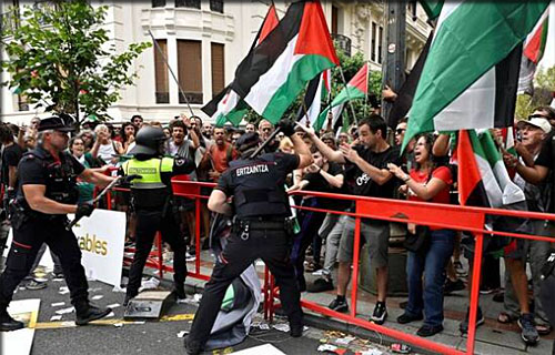 Malgré le caractère plutôt pacifique de la plupart des manifestants nous espérons ne pas avoir à assister durant la 12 ème étape à ces scènes de confrontation entre la Guardia civil et les manifestants pro palestiniens, comme hier à Bilbao ici sur la photo.