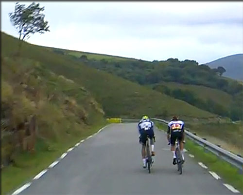 Ecart en train d'atteindre les 5 minutes avec les coureurs gripeurs qui commencent à se postionner à l'avant sachant que la route de la Collada de bernes est très étroite