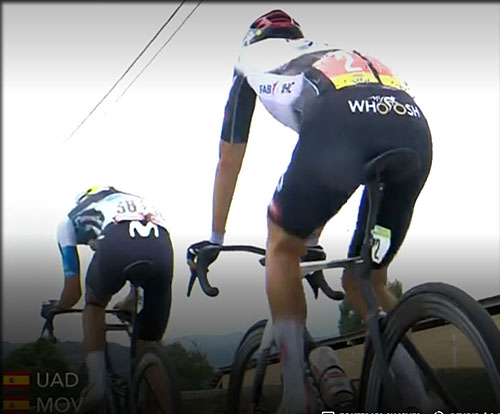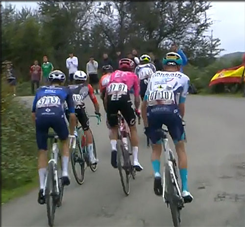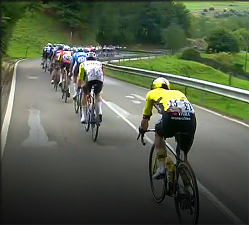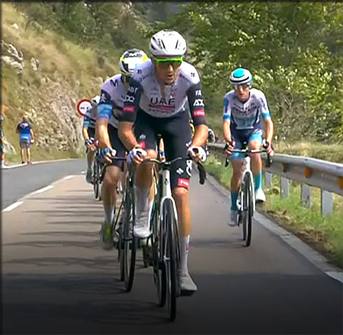 1 minute (redescendant à à 45" d'avance) au sommet du puerto de Alisas entre les 40 ou 50 ( environ) et le peloton emmené par les Visma avec Jay Vine dans les roues et bien sûr Vingegaard ( caché sur la photo)