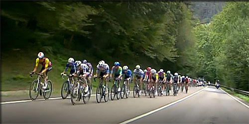 le peloton s'est élancé à vive allure comme tous les jours, peloton groupé en dépit des tentatives de sortie dans une première petite butte courte