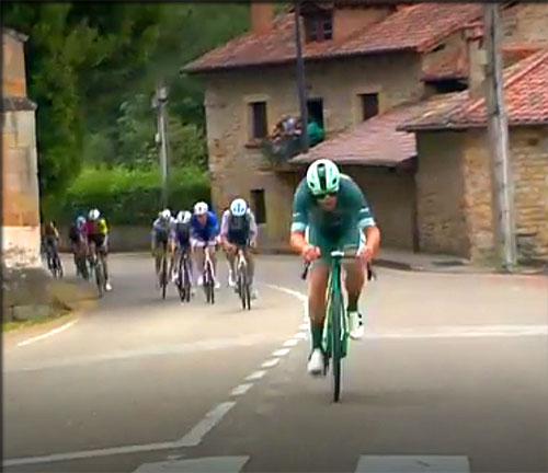 Les poursuivants menés par Campenaerts, Pedersen revenu dans la descente et le reste de l'échappée échouant a 17" et 18" de Ayuso