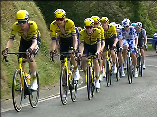 En prévision de ce qui attend demain les coureurs favoris, les VISMA se sont économisés, comme on pouvait s'y attendre, ne laissant filer dans l'échappée que des coureurs non placés dans les 10 premiers au général.