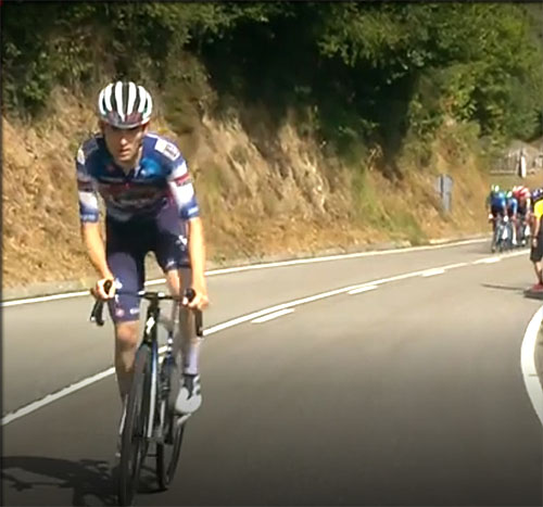 Campenaerts vient de crever et ne peut repartir qu'avec un vélo de rechange qui ne lui convient pas du tout, de l'assistance neutre, il peste de ne pas avoir la voiture de la Visma revenir assez vite, il cède et récupère trop tard son propre vélo de rechange
