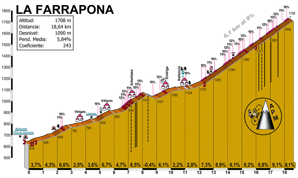 L'Alto de la Farrapona et ses pentes raides sont apparues dans La Vuelta en 2011. Cette ascension aux magnifiques paysages marque la frontière entre les Asturies et la province de León à son sommet . En 2025, ce sera la troisième fois que les deux sommets Angliru Farapona seront grimpés consécutivement dans les Asturies.