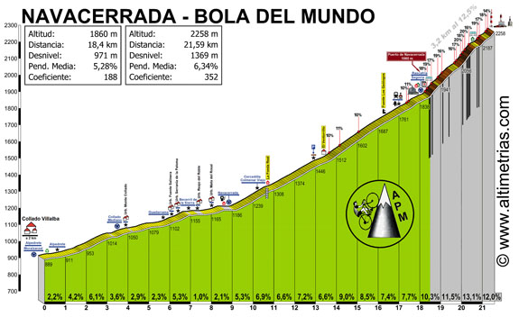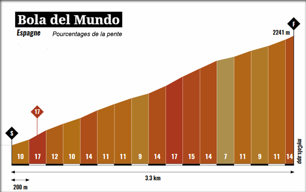 La Bola del Mundo c'est 3.3 km d'ascension finale avec une pente moyenne 12% jusqu'à des pourcentages atteignant 17% à mi parcours là ou se situent les plus forts pourcentages ainsi qu'au sommet: 100m à 14%. C'est plutôt la répétition des efforts avant son ascension qui sont source de difficulté, car en terme de pourcentages, l'Angliru est beaucoup plus dur.
