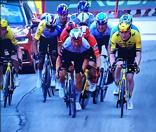 Au classement général sur la ligne du départ à OLOT,Vingegaard est talonné par 3 UAE à 8" de lui: Ayuso - Almeida - Soler, tous les trois dans le même temps, après l'arrivée du Chrono par équipes d'hier: